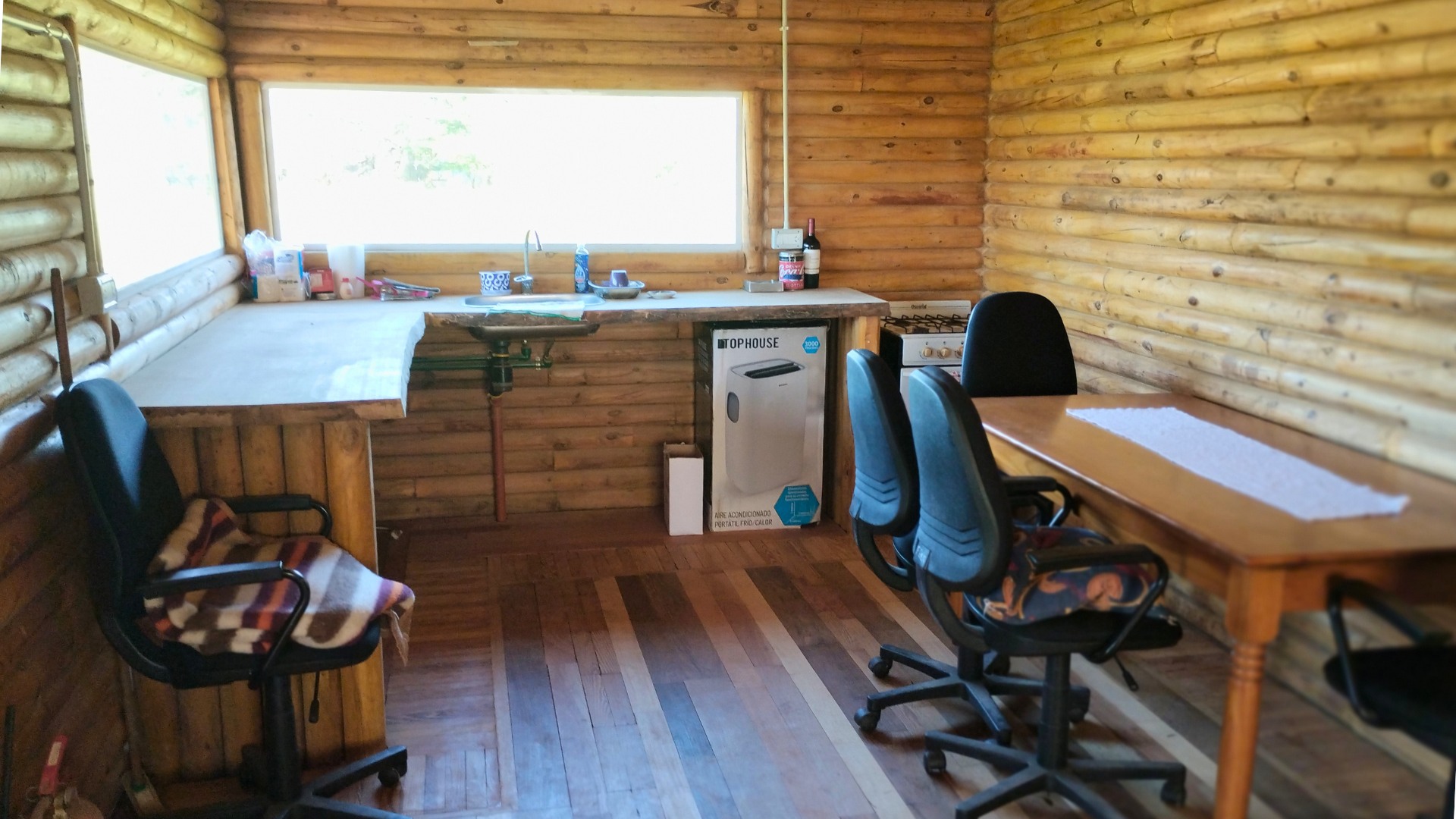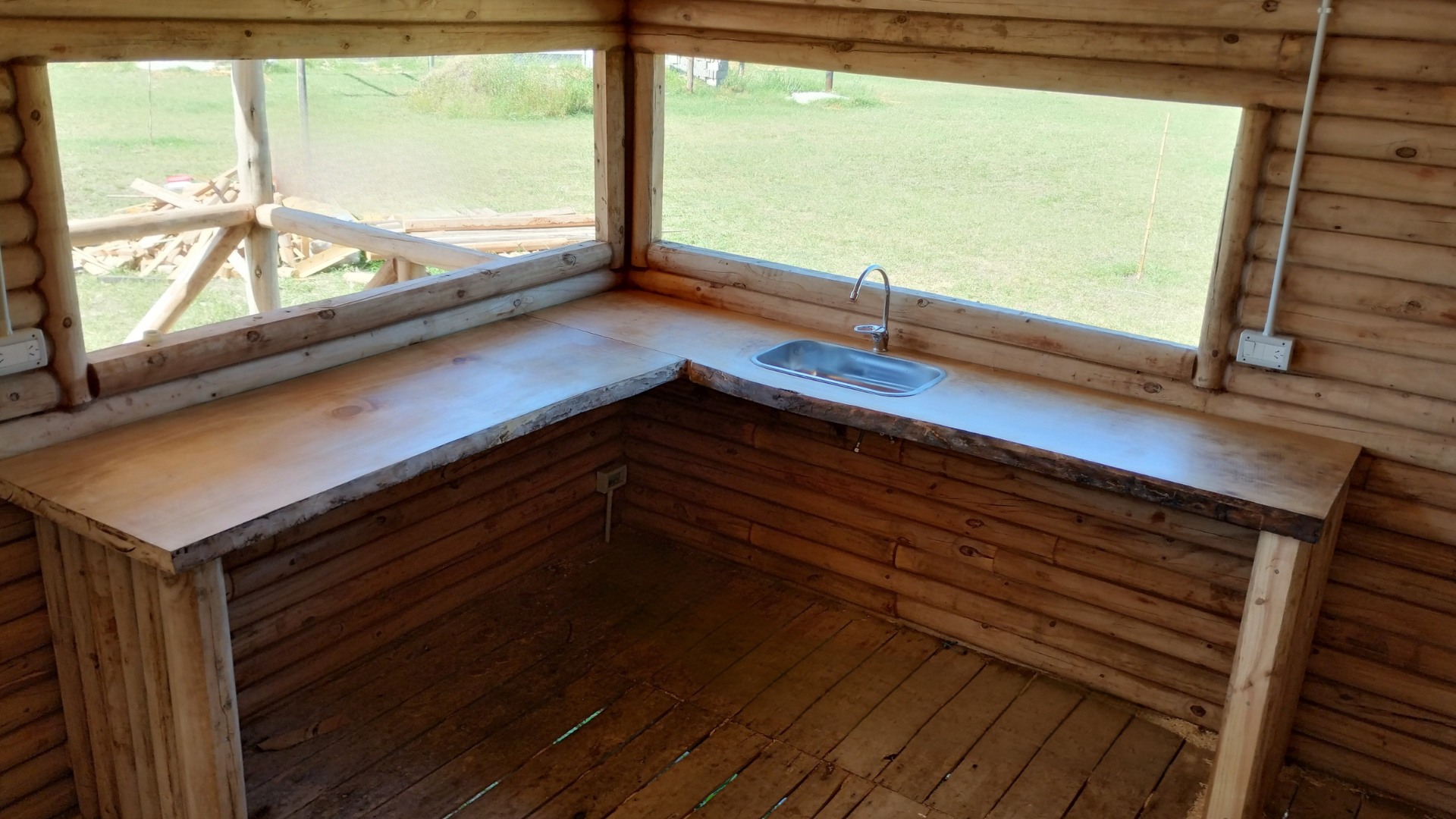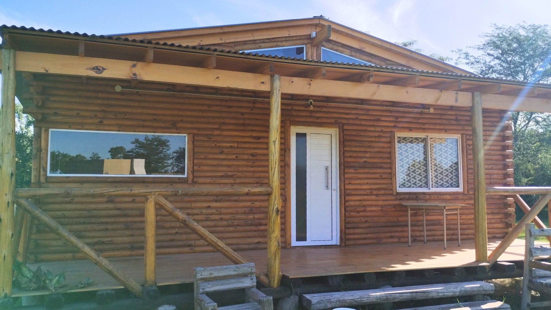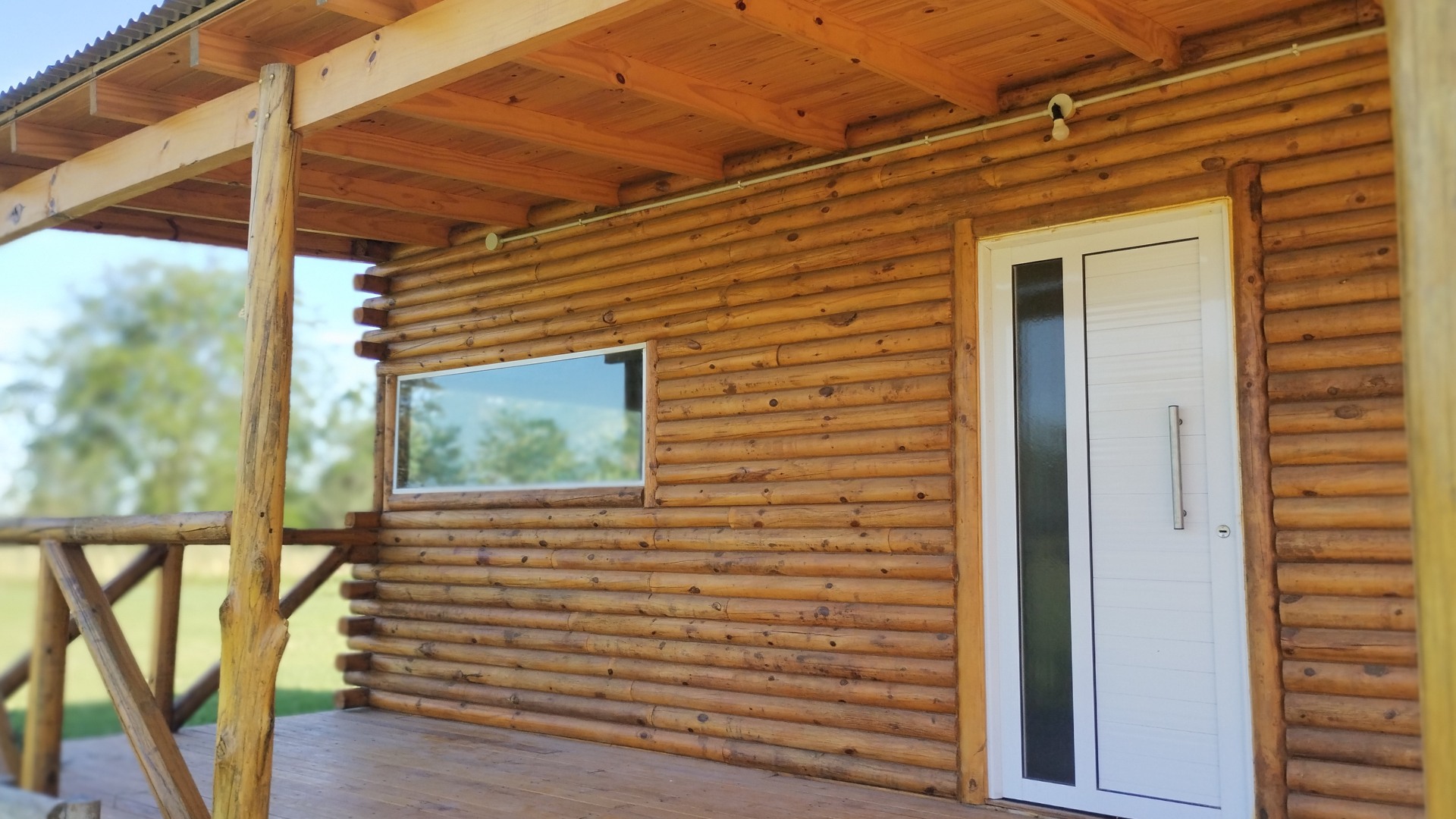 La cabaña se embellece con una hermosa y amplia galería semicubierta que abarca todo su frente, un lugar ideal para extender tus momentos de relax y disfrutar del aire libre. Para este proyecto, el cliente optó inteligentemente por aberturas de aluminio blanco comercial, con grandes paños fijos estratégicamente ubicados en la cocina. Esta elección no solo aporta un toque contemporáneo, sino que inunda el interior con abundante luz natural y enmarca una espectacular vista al parque, logrando una perfecta conexión entre el hogar y la belleza natural del exterior